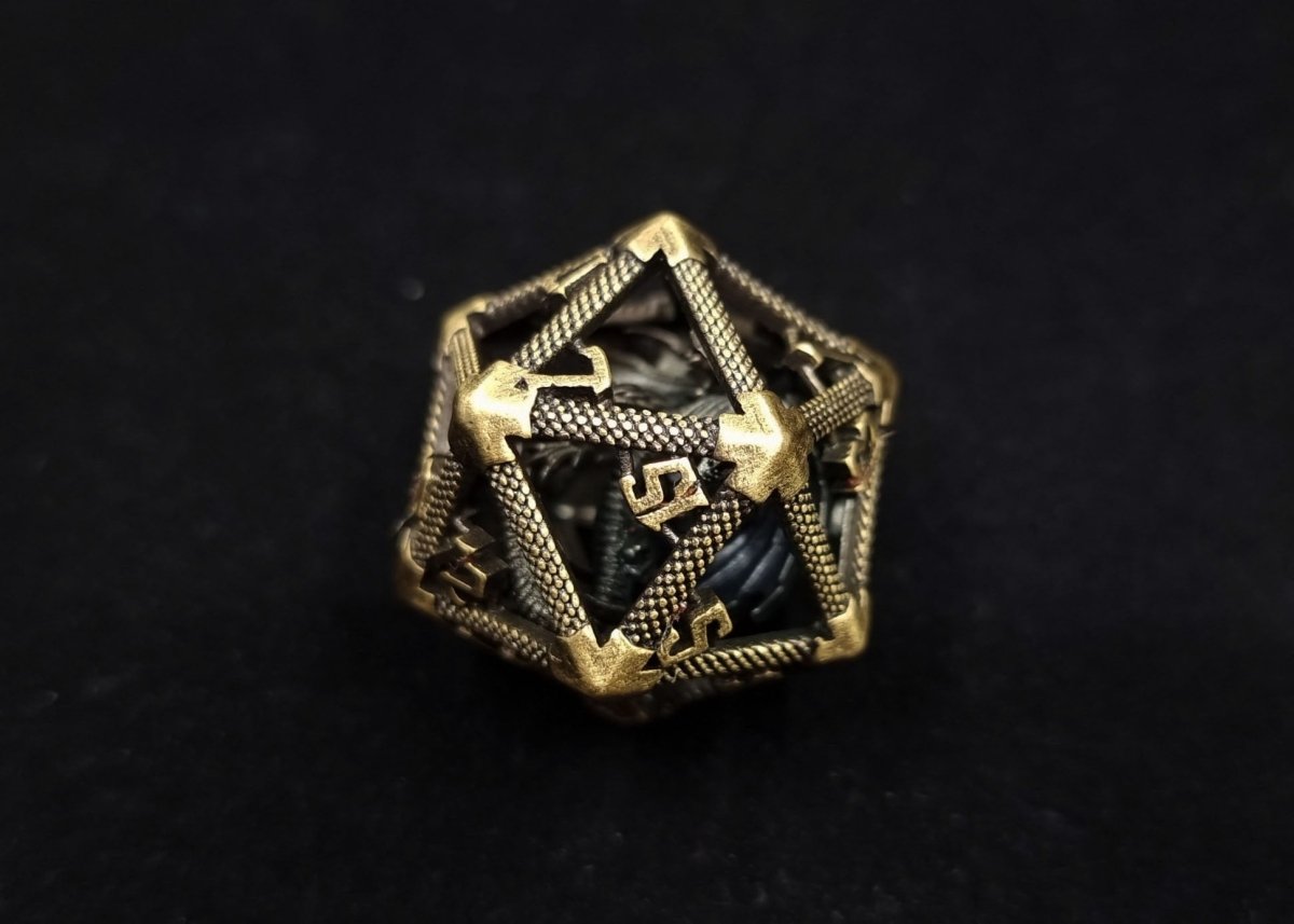 Yes, yes the rumours are true, this die in fact houses a miniature beast. Covered with intricate detailing and an eye-catching gold finish, its weathered exterior tells tales of long-forgotten legends. Encased in an intricately designed brass cage, it emanates an air of mystique and power. Its eyes, once filled with fiery determination, now hold the wisdom and knowledge of ages past.
