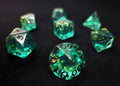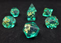Emerald green dice, shining with gold, gleam with an aura of ancient mysticism. The gold flakes within add a touch of opulence, as if these dice were forged from precious treasures hidden in forgotten temples. With each roll, they embody the spirit of adventure, evoking images of lush jungles and ancient civilizations.
