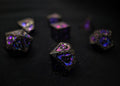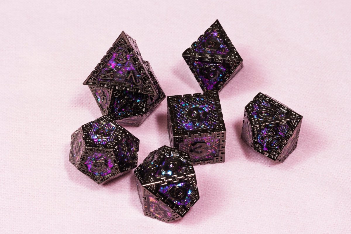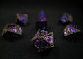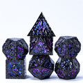 The beautiful Courting Nightmares metal dice boast a black deco outline over blue/purple shift glitter. Black numbers complete the moody, luxe design of these gorgeous dice.