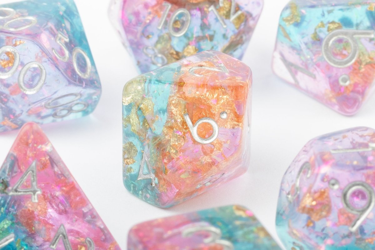Let your imagination soar with our 'Daydream' dice set, where translucent pink, blue, and purple hues swirl with glimmers of gold flakes. These ethereal dice evoke the dreamscape, inspiring whimsical adventures filled with magic and wonder. Journey into realms where reality blurs, and the line between day and dream is as thin as a roll of the dice.