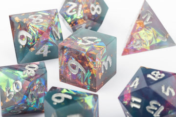 Unlock the cosmic energy of 'Dilithium Crystal' dice set, these captivating teal-colored dice feature stunning iridescent flakes inside, reminiscent of the rarest gems. These dice exude a futuristic allure, evoking the mystique of otherworldly crystals. Let the iridescent glimmers guide your rolls as you embark on thrilling adventures across the stars.