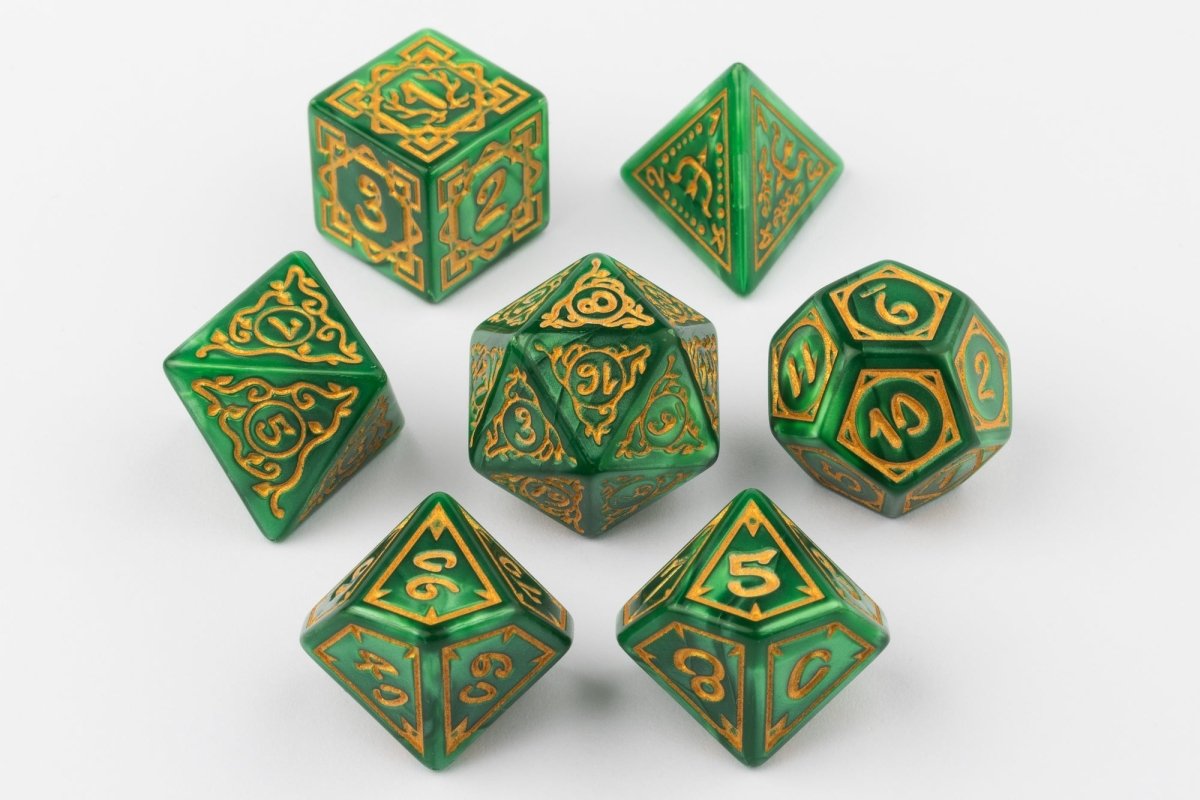Blending lush green tones with elegant gold stylised numbers, the 'Druid's Grove' dice set captures the spirit of nature. These dice are ideal for characters connected to the wild and mystical powers of the natural world. Channel the magic of 'Druid's Grove' in your tabletop adventures.