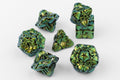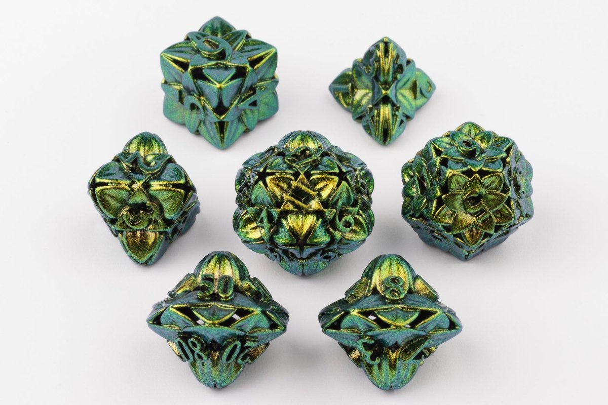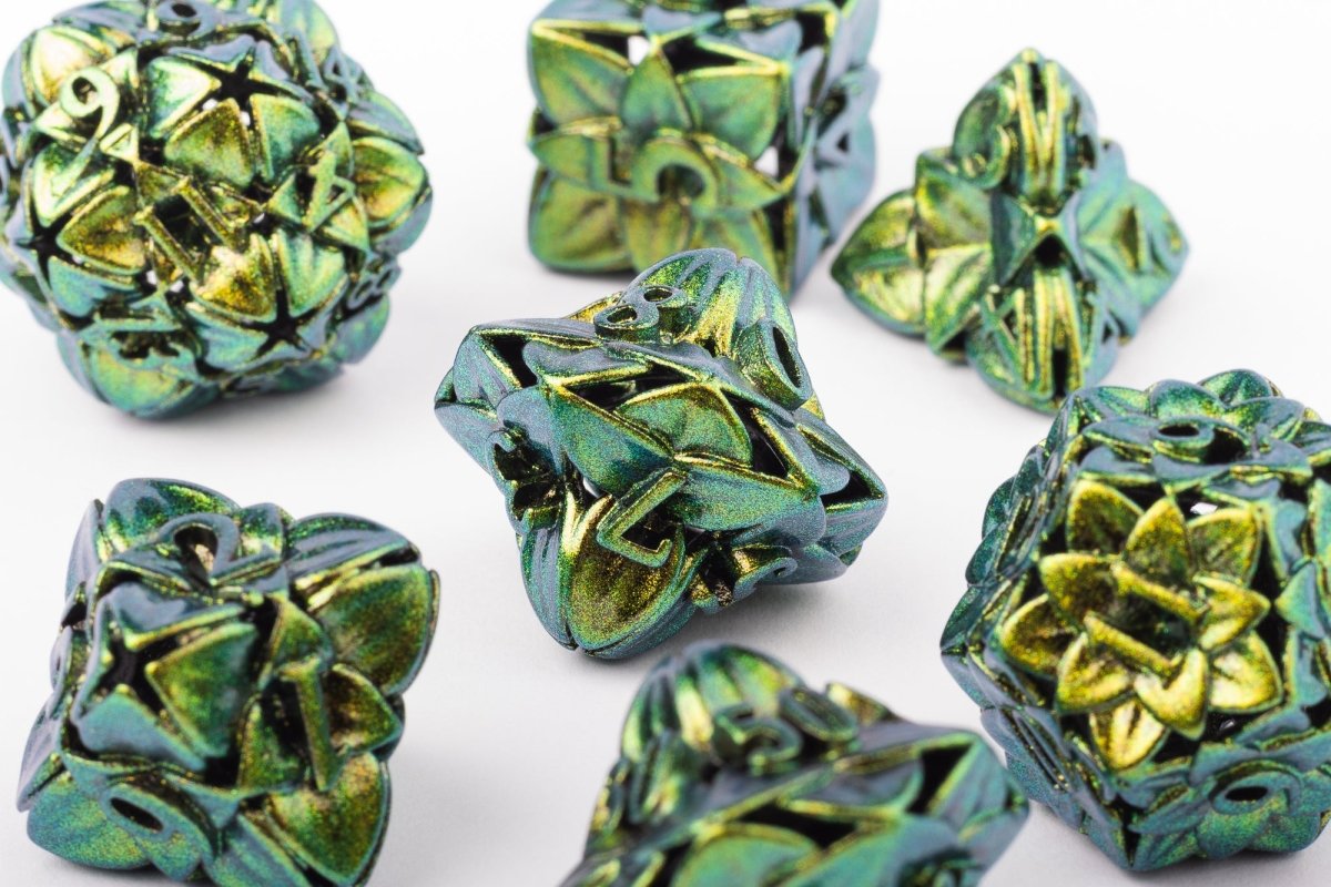 Step into the enchanting realm of 'Dryad's Hollow', where each surface of this stunning dice set blossoms like a delicate flower. These dice capture the essence of nature's beauty and are perfect for characters attuned to woodland spirits and mystical flora. Let 'Dryad's Hollow' dice inspire your journey through the verdant wilderness.