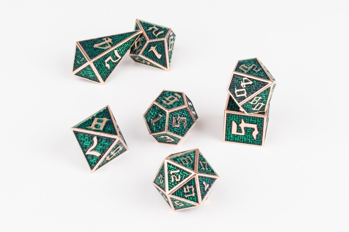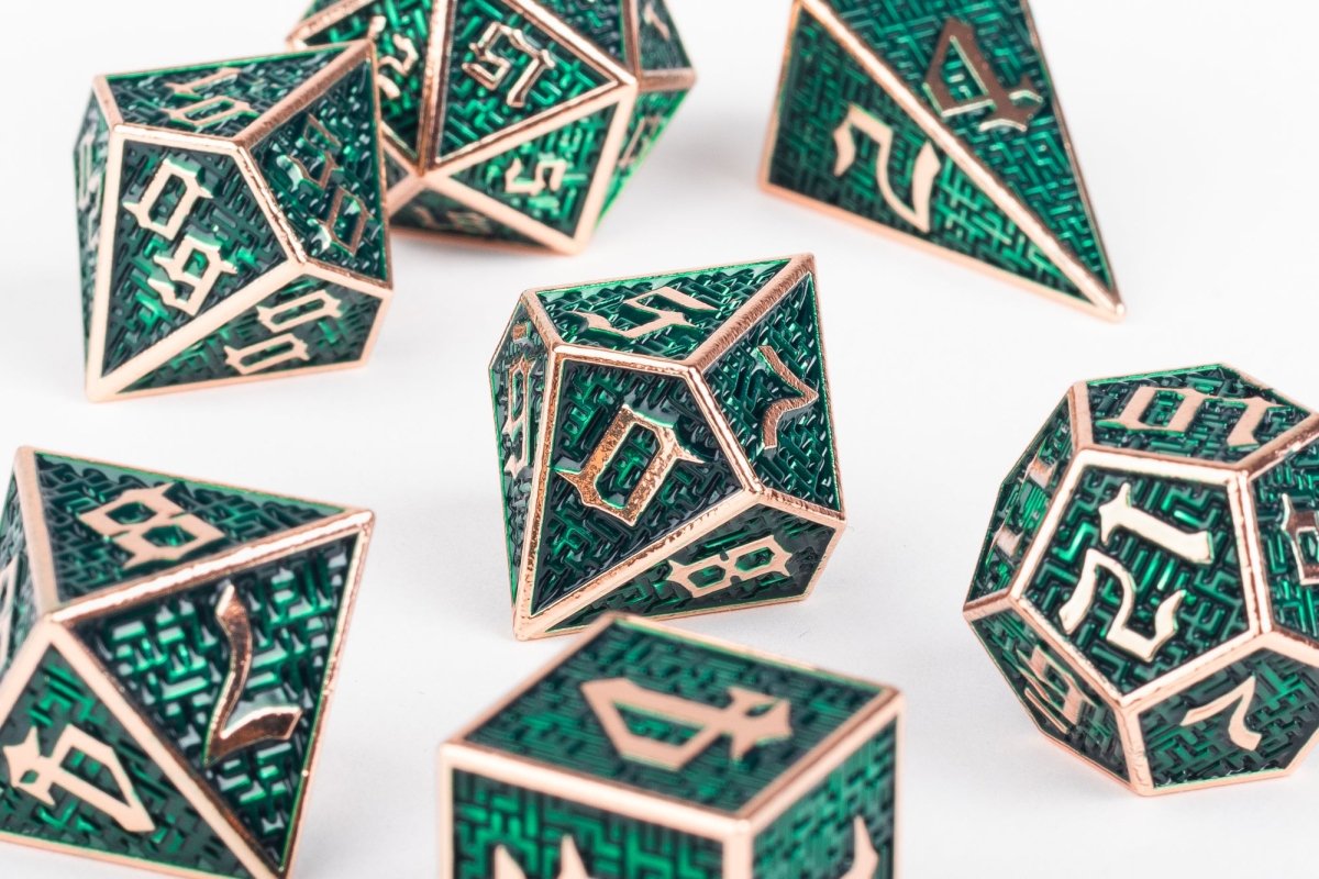 Grasping the green metal dice, a surge of anticipation ignites your senses, inviting you to embark on a captivating odyssey. The intricate labyrinthine design etched upon them hints at the grand adventure awaiting. With each roll, you delve deeper into the narrative, the glistening gold numbers casting an ethereal glow, guiding your journey through the mythical maze towards untold splendor and triumphant conquests.