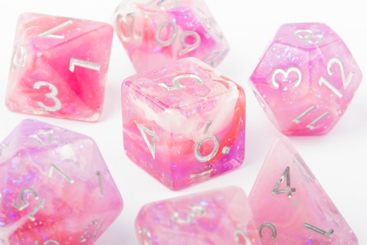 Indulge in enchantment with 'Lovestruck,' featuring dice adorned in pink, purple, and red swirls embellished with glitter. Roll these dice into tales of romantic whimsy and thrilling adventures, where every toss echoes the passionate hues of a captivating love story. Let 'Lovestruck' guide your journey through narratives spun in hues of affection and daring exploits.