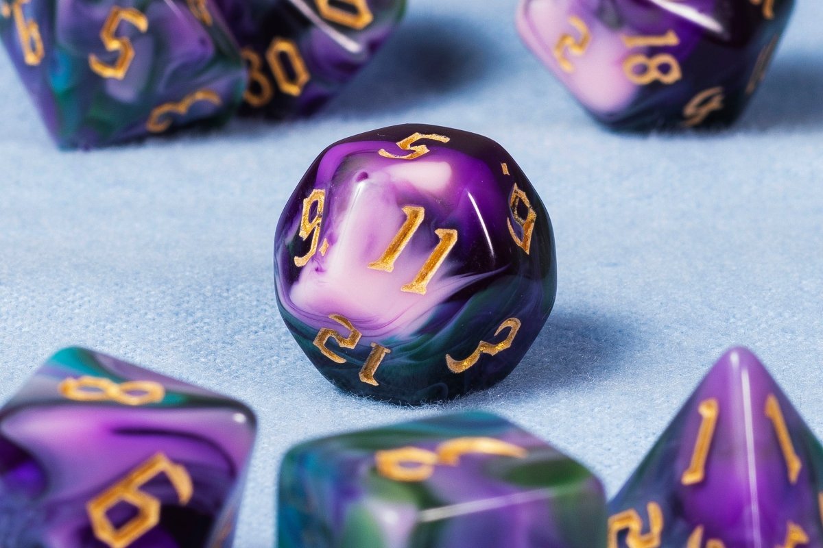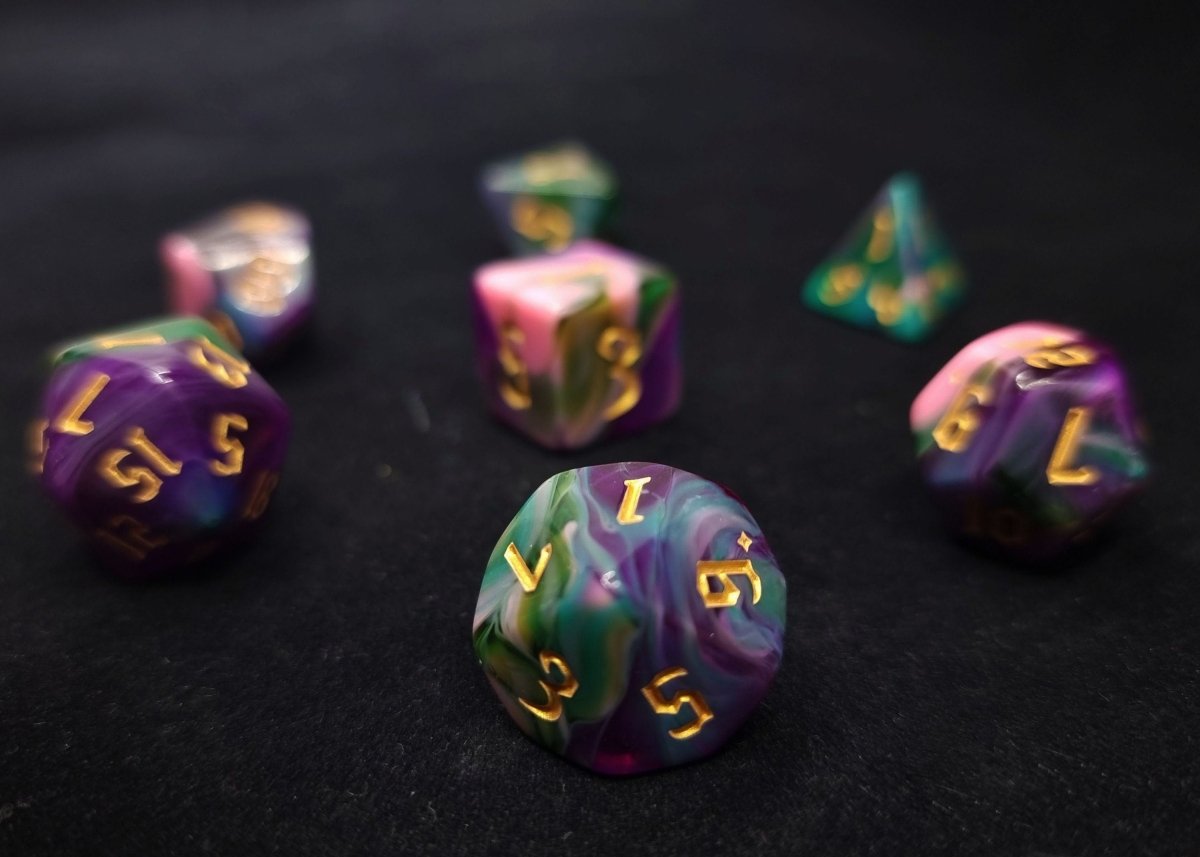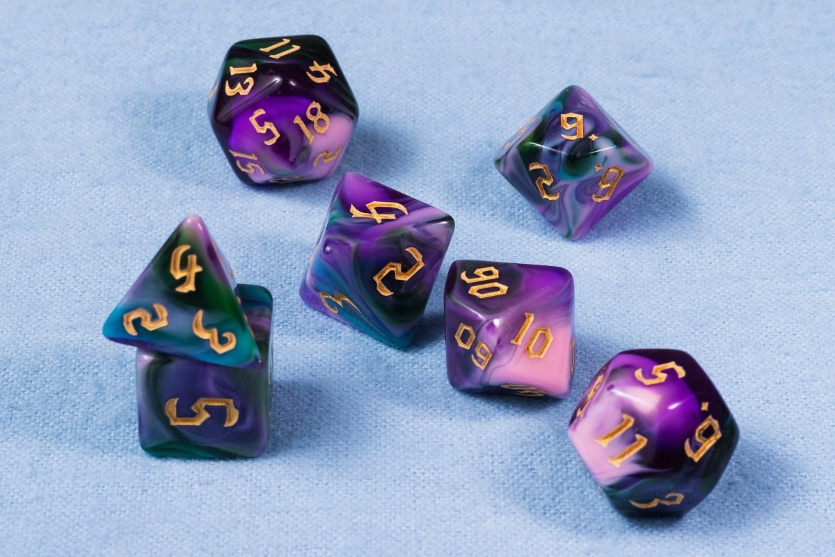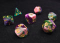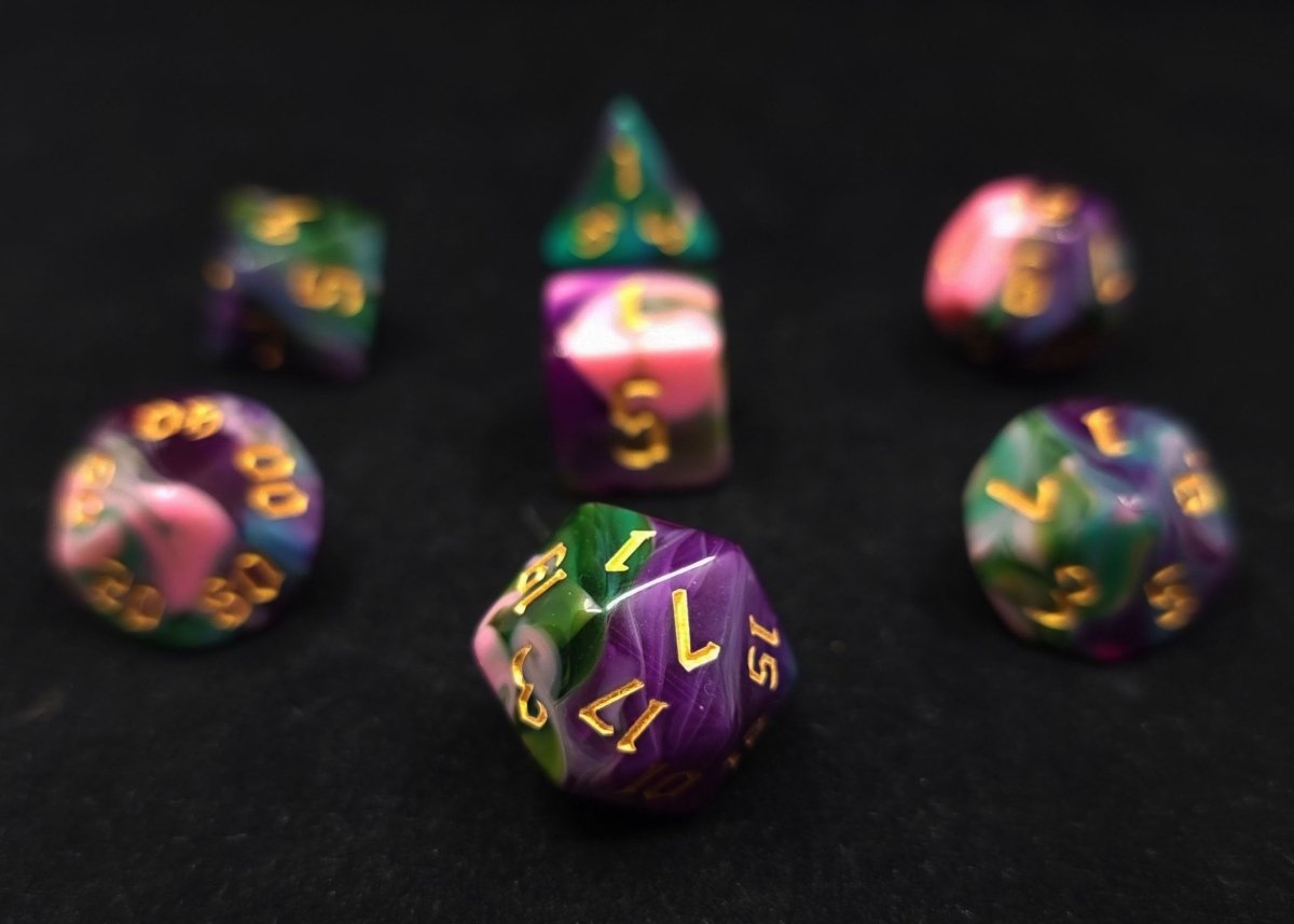 This plastic dice set boasts a vibrant and opaque blue, green, pink and purple swirl design.
