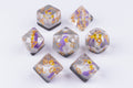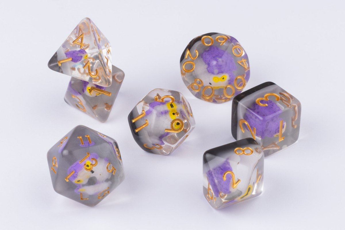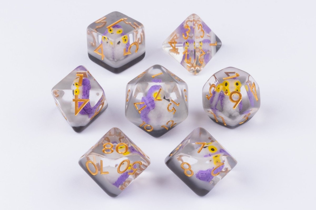Embrace the mystique of Night Owl dice set, featuring translucent dice adorned with a captivating purple owl figurine nestled amidst a striking black and white backdrop. These dice exude an air of nocturnal enchantment, inviting you to immerse yourself in the realm of darkness and wisdom with every roll. Let the owls guide your fate as you embark on thrilling adventures in the shadows, they are sure to be a hoot at your table!