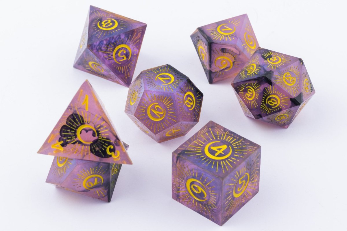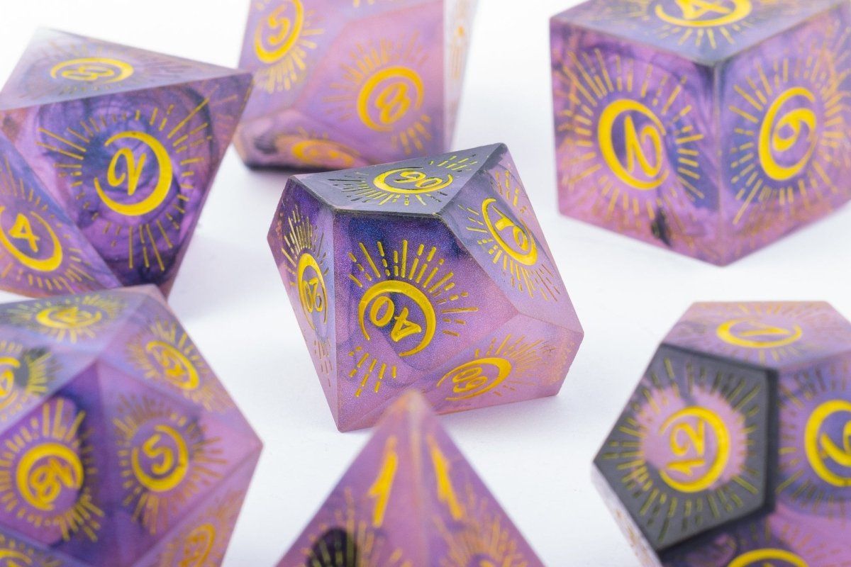 Indulge in the mystical beauty of Rising Moon Purple dice set. These mesmerising swirling purple dice are adorned with intricate golden moon-themed numbers on each face, casting a spell of elegance and enchantment. Let the celestial allure of the golden moon guide your fate and immerse yourself in a world of magical possibilities.