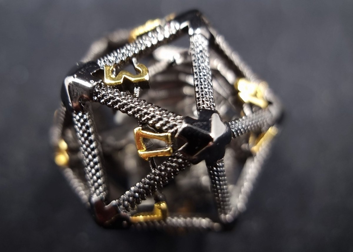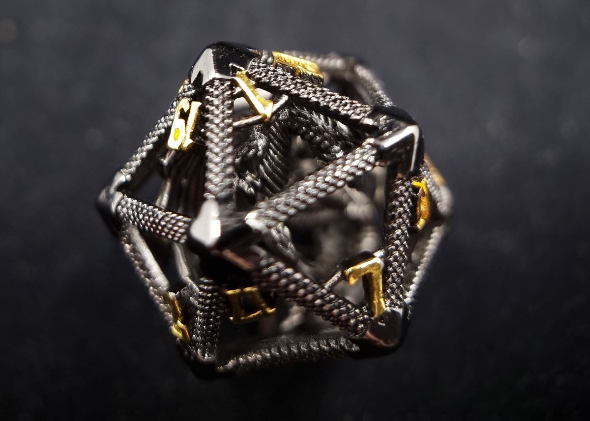 You've never known power like the feeling of turning this d20 in your hand, revving up for the roll of a lifetime. This metal die has a black finish with luxe gold numbers. Not to forget, the fiery metal dragon that lies beneath this cages frame.