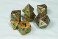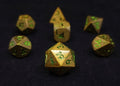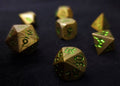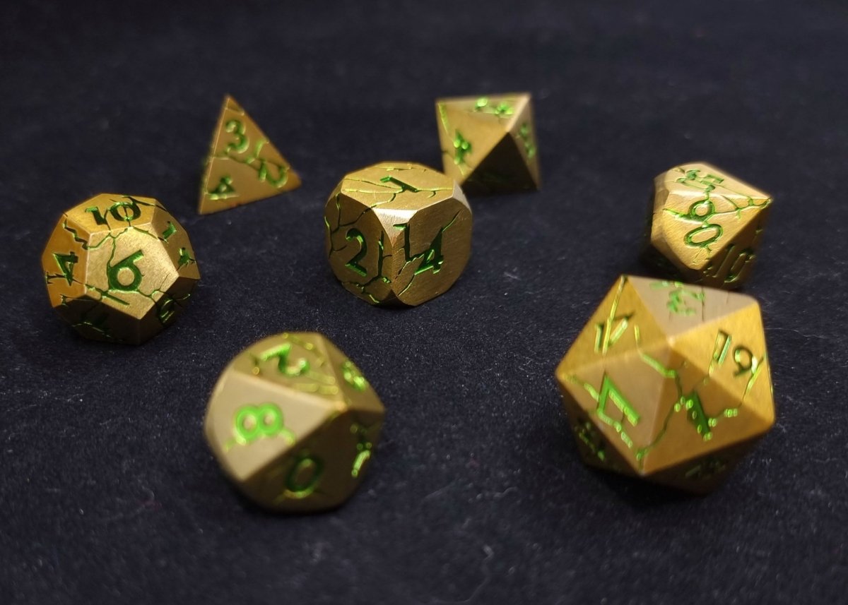 These spicy, gold, metal dice boast seriously impressive crack details, oozing a poisonous light green sludge with matching numbers to boot.